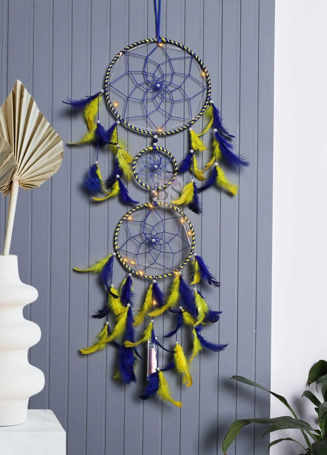 Dream Catcher Wall Hanging Beaded 3 Ring Yellow Blue