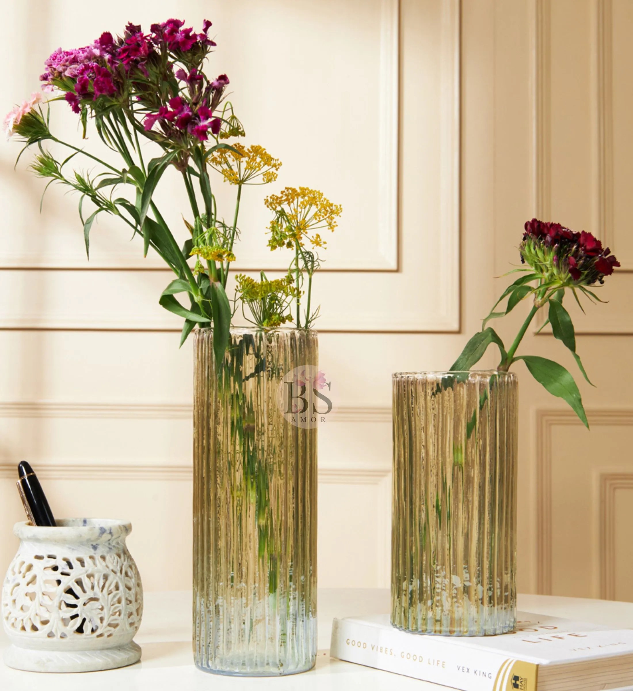 - [Easy to clean] Axial Lines translucent surface. The vase has a wide mouth design, which is convenient for hands to reach into the vase for cleaning.